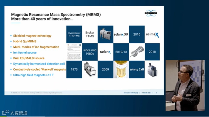 首先,布鲁克全球MRMS业务高级副总裁Paul Speir博士分享了布鲁克公司在MRMS领域近四十年的技术创新与应用,包括高场磁体技术、免液氦维护Maxwell磁体、ParaCell™和谐阱等,使得磁共振质谱可以提供超过两千万(R>20,000,000)的质量分辨率,成为市场上最高分辨率的质谱系统。同时,近年来,布鲁克创新性TIMS技术为分析领域带来了新的维度和深度,而鲁昂大学/法国国家科学研究中心的全球第一台18T timsMRMS系统,其质量与淌度的双重极致分辨将为超复杂样品分析提供新的发现,助力生命科学、环境监测、能源研究及蛋白质组学等领域的发展。