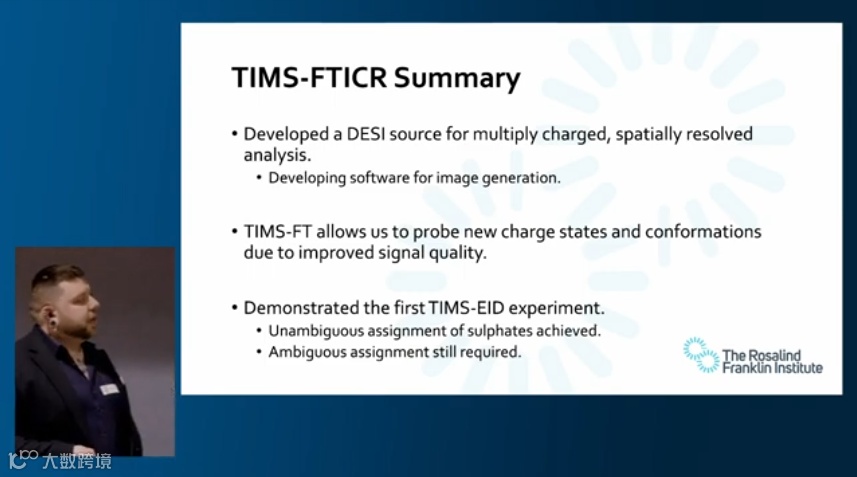 英国罗莎琳德·富兰克林研究所Anthony Devlin博士绍了利用timsMRMS技术分析糖胺聚糖(GAGs)的研究进展。GAGs 作为高阴离子电荷的复杂碳水化合物,其硫酸化模式与疾病(如乳腺癌)的发展密切相关,但传统分析方法存在分辨率低、分析速度慢等局限。研究团队通过优化 TIMS 参数(如电压斜坡、窗口宽度)以分离 GAG 异构体。结合 MRMS 的超高分辨率,成功解析了 GAG 的硫酸化位点和序列,同时首次开展了 TIMS-EID 实验,通过电子诱导解离获得关键碎片信息,大大提升了 GAG 结构确证的准确性。