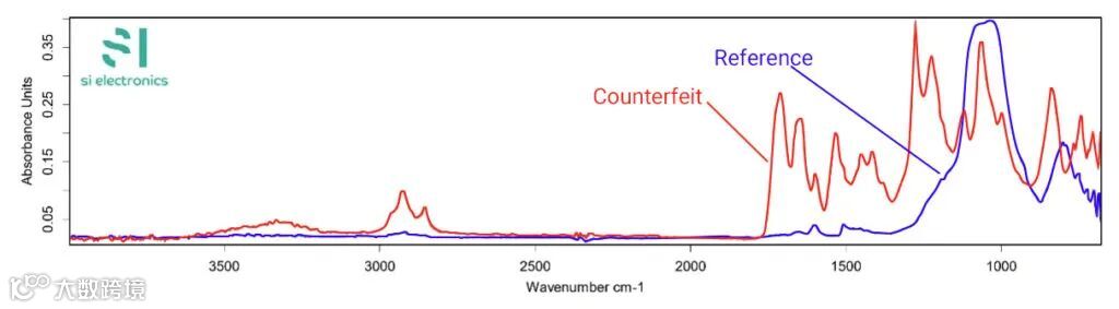 假冒产品在2800-3000 cm-1和1800-1000 cm-1之间的区域出现了显著的峰值。这些峰值属于额外添加的环氧树脂,在原始元器件中这些吸收峰并不明显。