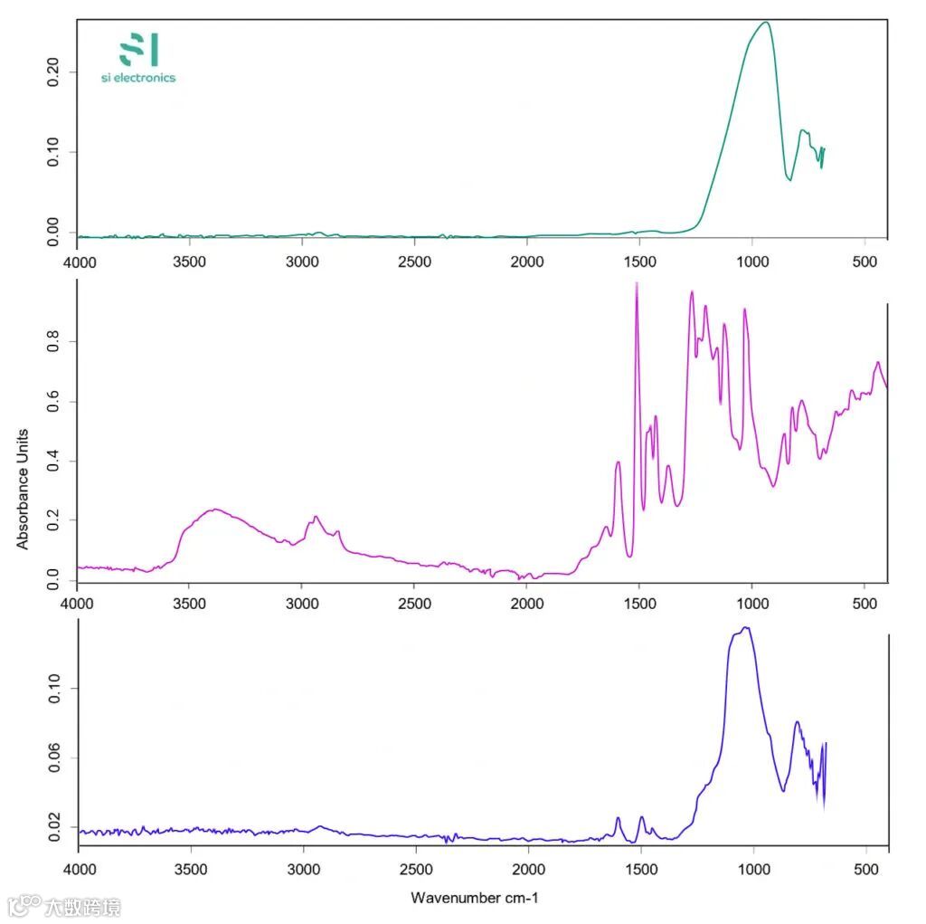为确保成分的均匀分布和注型材料的充分固化,这种混合物通过注塑成型形成最终形状。下图展示了工业灰(绿色)、环氧树脂(紫色)和原始注型化合物(蓝色)的FTIR光谱。