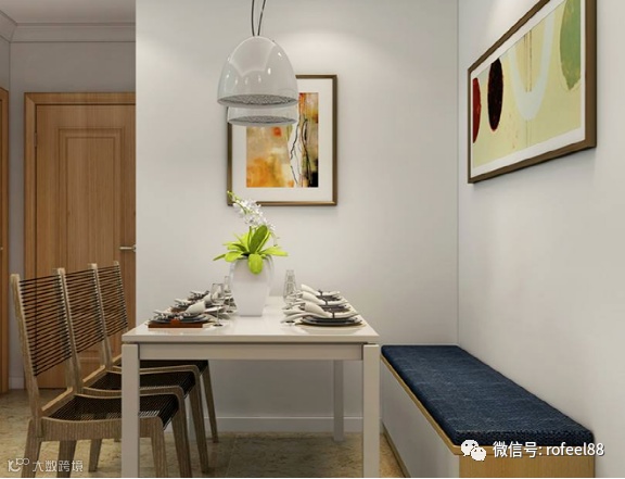 餐厅作为一个吃饭的地方,在设计上可以选择比较简洁的搭配,墙面和柜子都选择冷色调,再用一些绿植和挂画点缀。