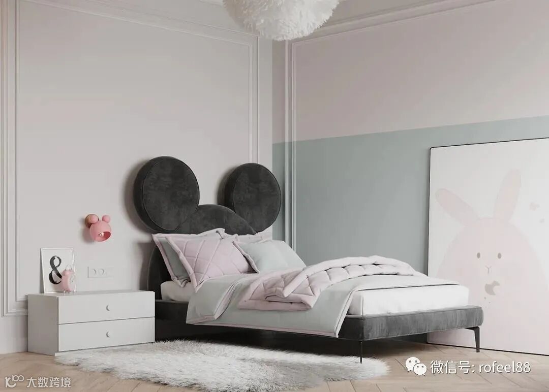 儿童房充满童趣、温馨、浪漫。温暖的粉色和薄荷色相搭配,让孩子从小住到大都不腻。床上方温暖的光线,点亮了这个舒适的空间。