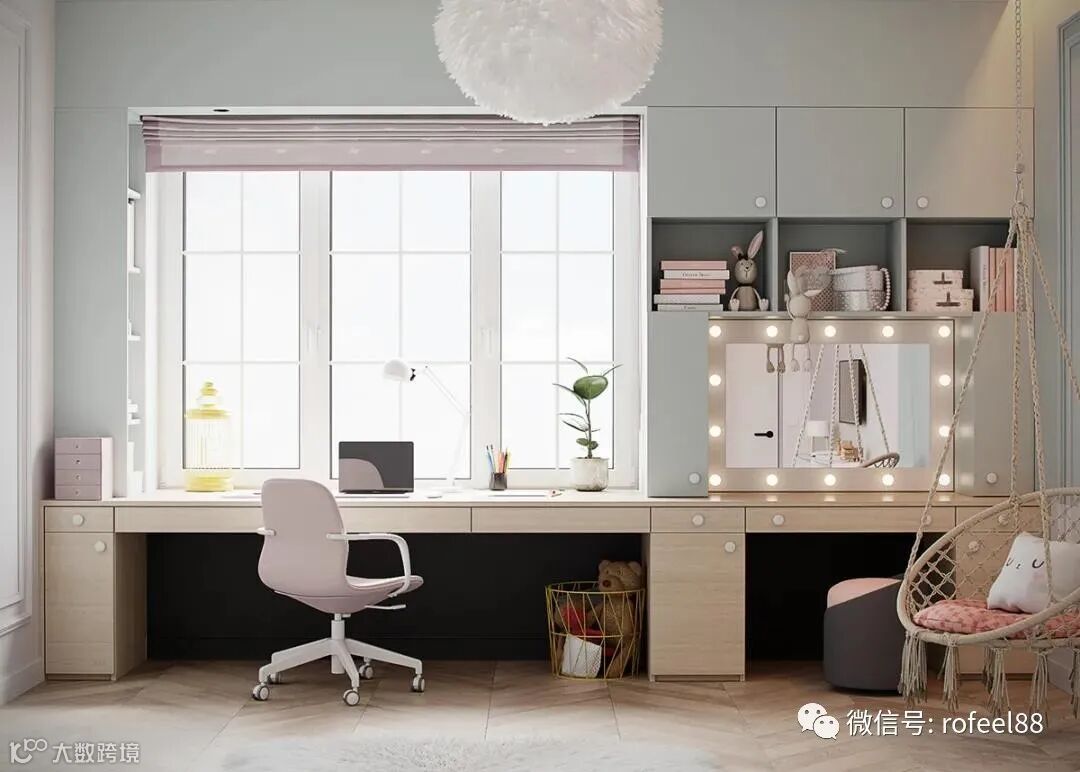 儿童房靠窗定制大书桌,孩子学习时家长可以在一旁辅导。另一边是梳妆台,让孩子从小就养成整理仪容仪表的习惯。