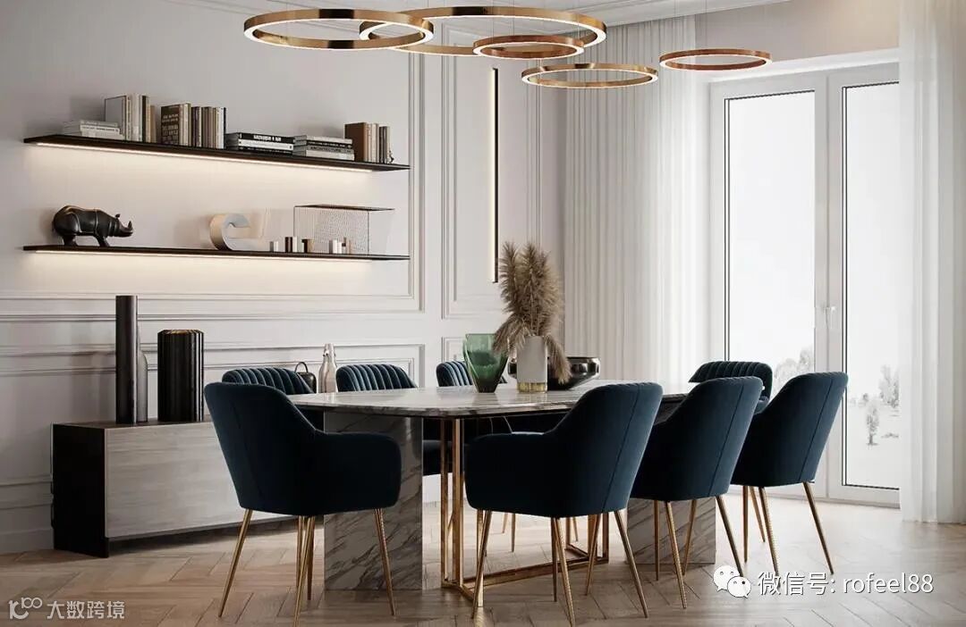 大理石纹理的餐桌搭配深蓝色的餐椅,白色的窗帘,带来一丝朦胧的浪漫。金色吊灯垂坠而下,装饰了空间,也装点了生活。