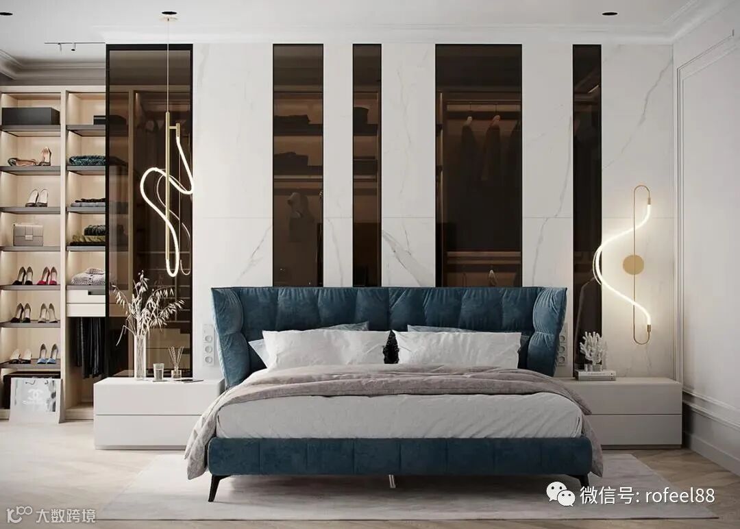床头没有靠墙,后面还藏着一个衣帽间,也为主卧的衣物收纳提供了更多的便利性。