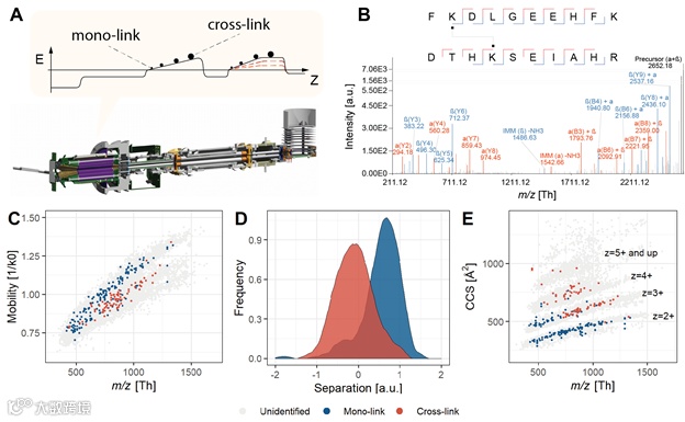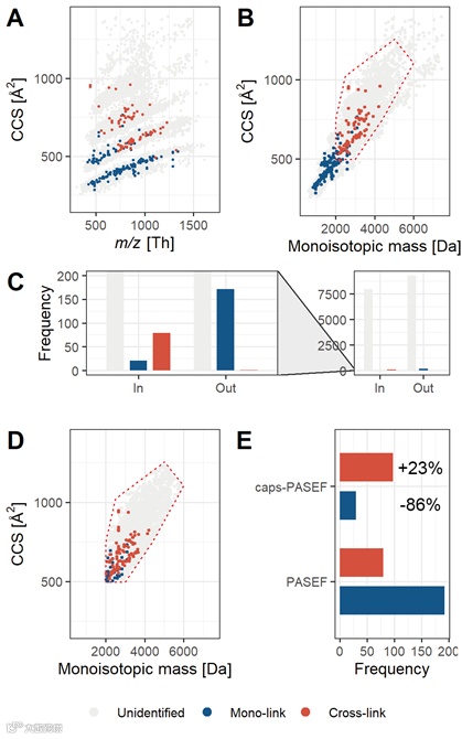 图3. caps-PASEF扫描模式用于交联肽段的分离和鉴定。A. 母离子的淌度碰撞截面积CCS和m/z分布图;B. 母离子的淌度碰撞截面积CCS和m分布图,红色虚框里是母子扫描区域;C. 选择框内、外,交联肽段、单侧连接肽段的母离子数目统计;D. 选择框内的母离子CCS和m分布图;E. caps-PASEF和经典PASEF扫描模式下,交联肽段、单侧连接肽段的母离子数目统计。(红色为交联肽段;蓝色为单侧修饰肽段;灰色为其他母离子)