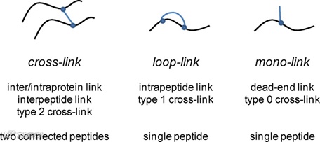 图1. 化学交联产物的类型(肽段间交联、肽段内交联、单侧修饰的单肽段)