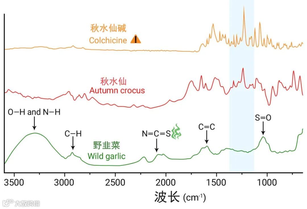 使用傅立叶变换红外光谱技术(FTIR),识别野韭菜和秋水仙的独特光谱特征,从而区分二者。这种方法展示了光谱分析技术在辨别和区分植物标本方面的潜力。