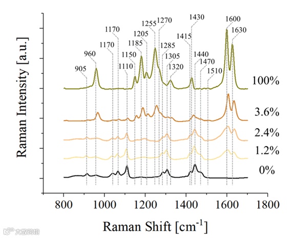 图 1. 不同浓度姜黄素-PCL复合材料的拉曼光谱,显示二酮峰(~950/1245 cm⁻¹)的消失与重现,100%的表示纯姜黄素粉末