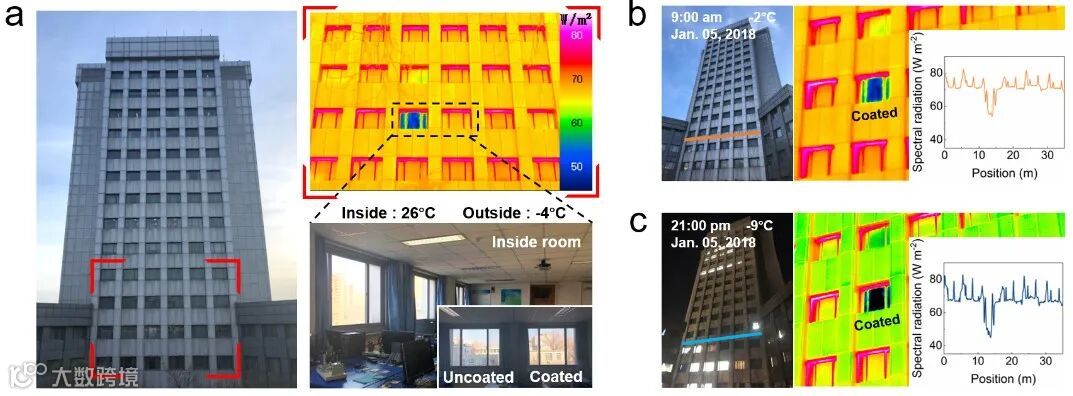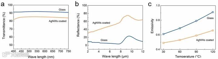 在低辐射材料的研发过程中,红外光谱分析能有效帮助研究人员测试、分析材料光学性能,并指导材料优化方向。近日,清华大学团队研发了一种基于一维金属银纳米线的新型低辐射玻璃。借助布鲁克VERTEX 70v傅立叶红外光谱仪,研究人员发现这种银纳米线低辐射玻璃具有高于传统低辐射玻璃的可见光透过率(图1.a),和较高的中红外反射率(10μm 波长反射率约60%,图1.b)。在进一步优化和调控后,这种基于银纳米线的低辐射玻璃可以使建筑窗户在冬季向外辐射降低约30%(图2)。