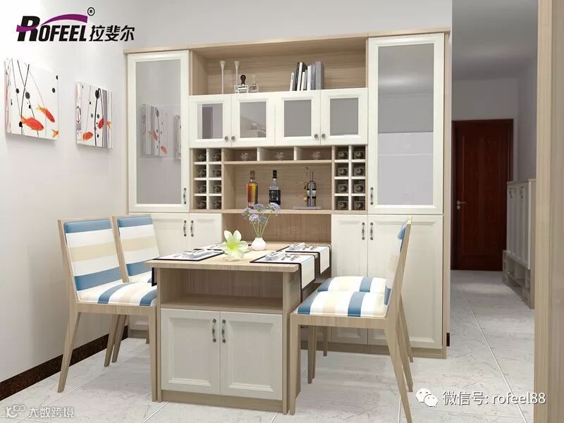 餐厅酒柜风格多样,材质不同,款式各异,但它带给人们的都是对美好生活的无限向往。搭配纯白柜体,整个空间清新舒适,再与暖黄灯光搭配,显得更加温馨。