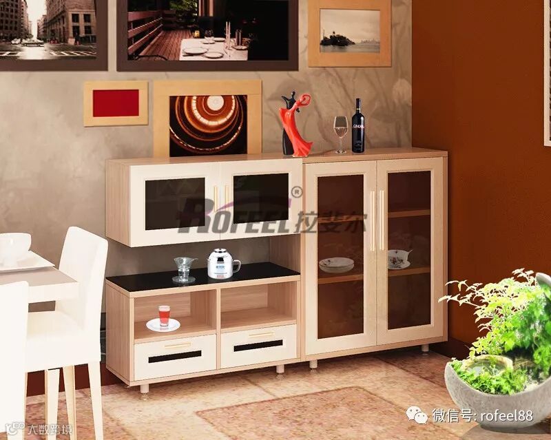矮柜形式的餐边柜,有放大空间的效果,使空间的视野更加开阔。柜面上的空间还可用来展示各类照片、摆饰品、餐具等,也有人直接将它当作电视柜使用。