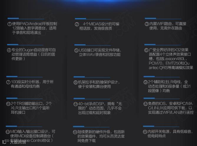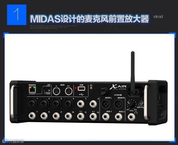 革命性的XR12拥有12路输入和4路混音母线,我们将XR12的一切零部件集中安置在一个便携式的坚固机架里面,只需使用iPad和Android平板电脑就能控制它。XR12非常适合于现场扩声和录音工作室,它拥有4个MIDAS设计的顶级麦克风前置放大器,内置了无线路由模块用于无线遥控,此外我们还为XR12配置了一张双向传输的USB音频接口12路,4母线数字调音台,针对IPAD和安卓平板设计。配有16个可编程MIDAS前置放大器,内置wifi模块和2通道USB音频接口