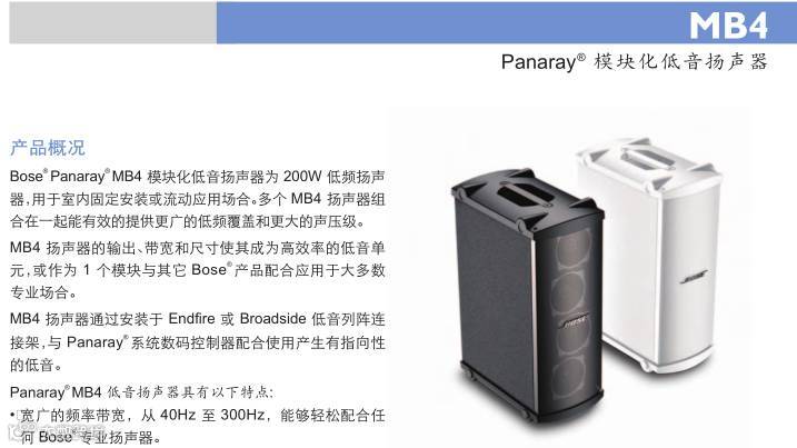 Panaray MB4扬声器设计为大到小型场所固定安装或便携式应用提供低频扩展。其大功率输出、宽频率范围、紧凑的尺寸,使MB4扬声器成为与Bose Panaray系列其它扬声器配合使用的理想选择,无论何种场合都能提供恰到好处的低频响应。从中小型场所,例如酒吧、餐馆、俱乐部、宾馆和零售商店环境,到大型场所,如宗教仪式场所或剧院,MB4扬声器都能满足您的商业需求。