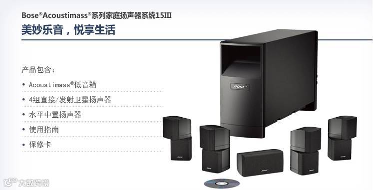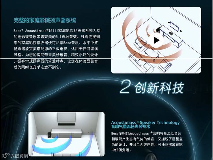 Acoustimass® 音响气量流低音箱配合小型扬声器,就能输出广阔的影院声效。已获专利的Bose设计能为所有声道产生低频声音,更不会造成可听失真。当低音箱被放置在窗帘或椅子后时,所有声音都似乎直接从小型卫星扬声器传出。