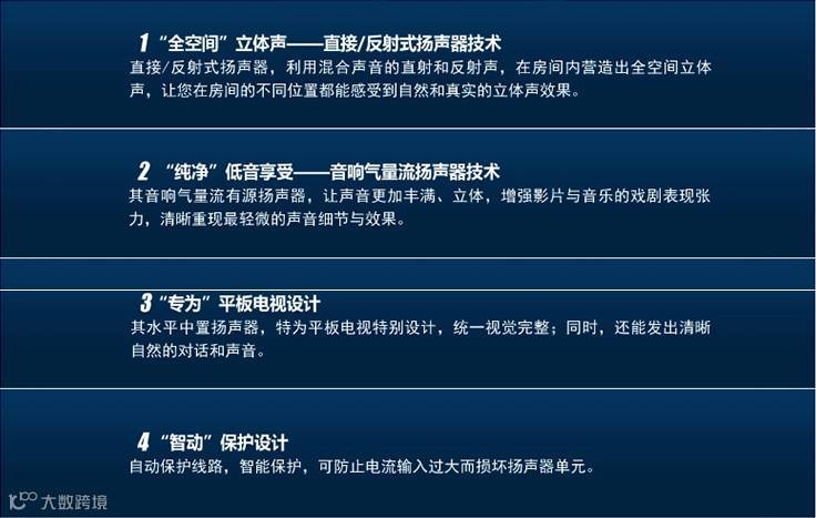 平置式中置扬声器设计的视觉效果和平面电视显示器配合得宜,并能输出音调自然的对话和声乐部份。