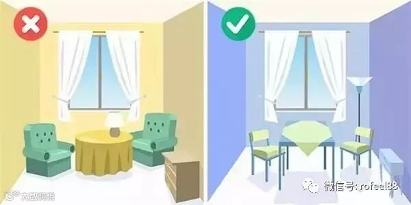 沙发坐起来虽然舒服,但却会让狭窄的房间看起来更小,高脚家具却能创造出更多空间,看起来也会更加清爽;相应的桌布也不宜使用垂坠型,为桌面量身打造适当大小最适合。