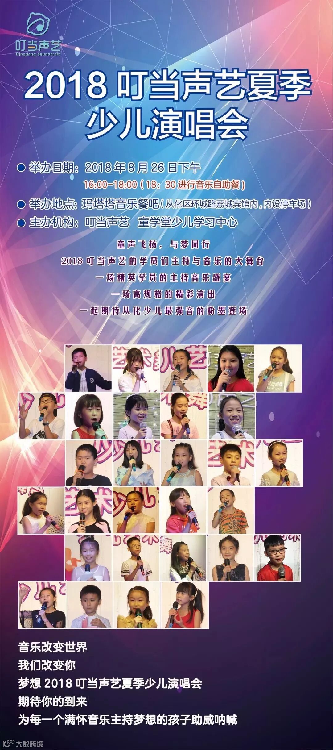 2018叮当声艺的学员们主持与音乐的大舞台,一场精英学员的主持音乐盛宴,一场高品质的华丽演出。叮当声艺年度优秀学员成绩汇总,一次里程碑式的舞台表演,8月26日我们一起期待从化少儿最强音的粉墨登场。