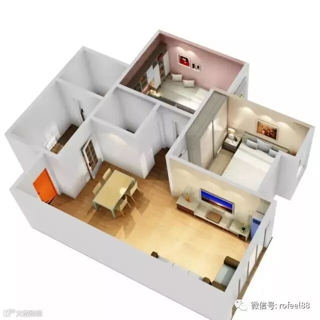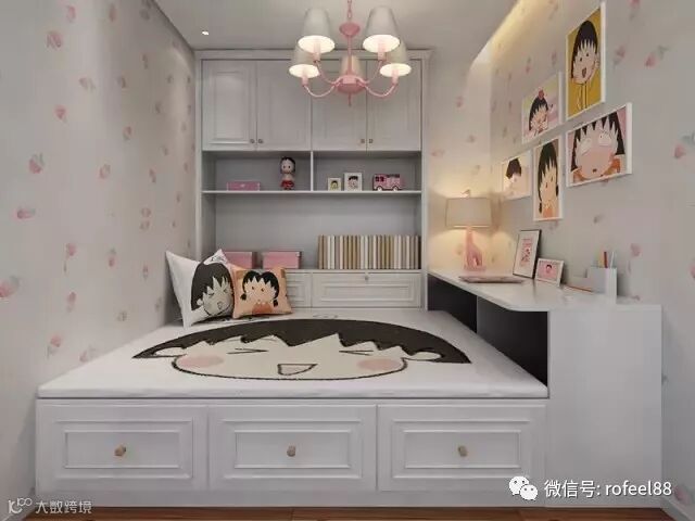 将小卧室设计为成长型的儿童房,满足孩子成长的需求。巧妙的是,将榻榻米床、书桌和书柜整合在一起,留出3㎡甚至更多的活动空间便不成问题;置顶的书柜、以及含抽屉的榻榻米有足够的空间收纳书籍、玩具。
