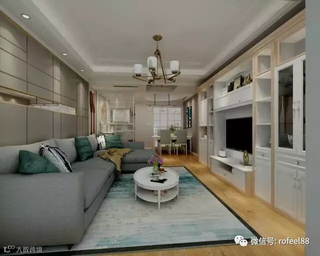 不仅包含电视柜,还从两边进行了柜体的延伸,最大限度地增加了储物空间,让客厅更具整洁性。L型转角布艺沙发,让客厅色调更加柔和与协调。