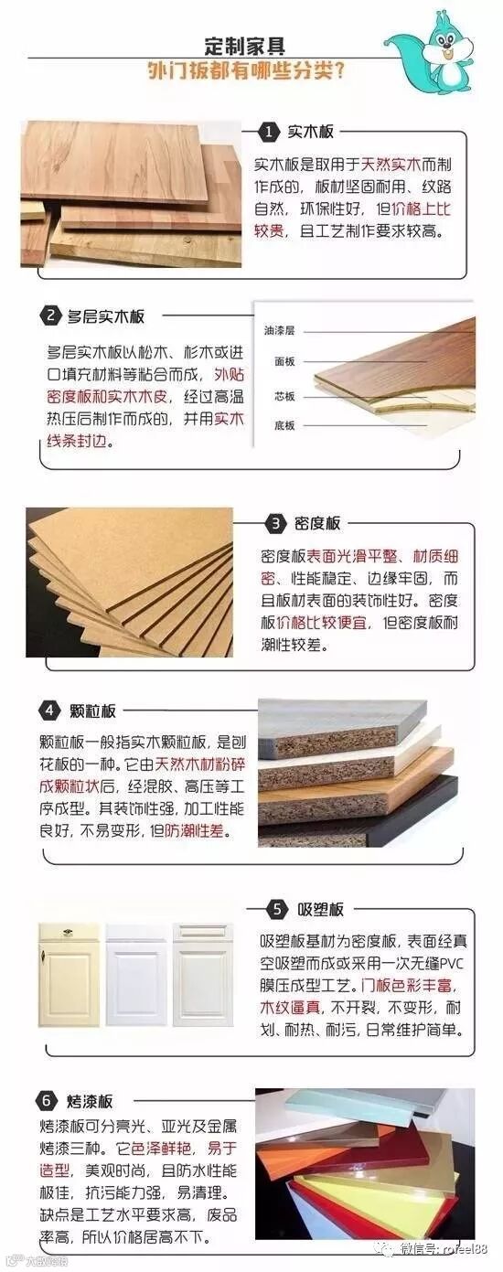 现在市面上的定制家具门板板材主要有:实木板、实木多层板、密度板(高纤板&中纤板)、颗粒板(刨花板)、吸塑板、烤漆板等等。