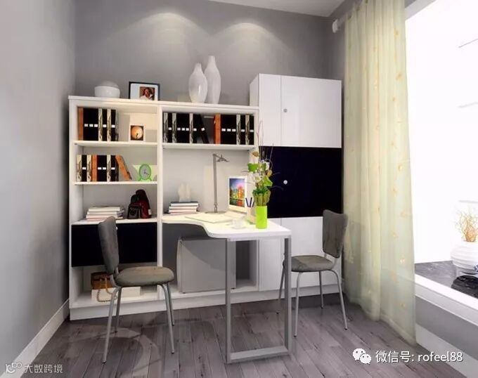 将整面墙的一半空间设计成书柜,剩下的一半用做其他,如放置一张小型办公桌或者是小型沙发,坐卧躺各种姿势任君选择。