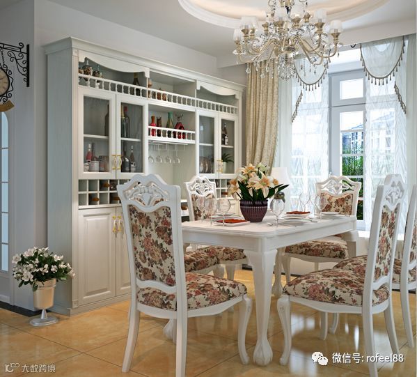 餐厅区域也不能浪费,可以做一个储物和装饰兼具的餐边柜,完善整个就餐空间,摆点红酒、碟子会很有情调。