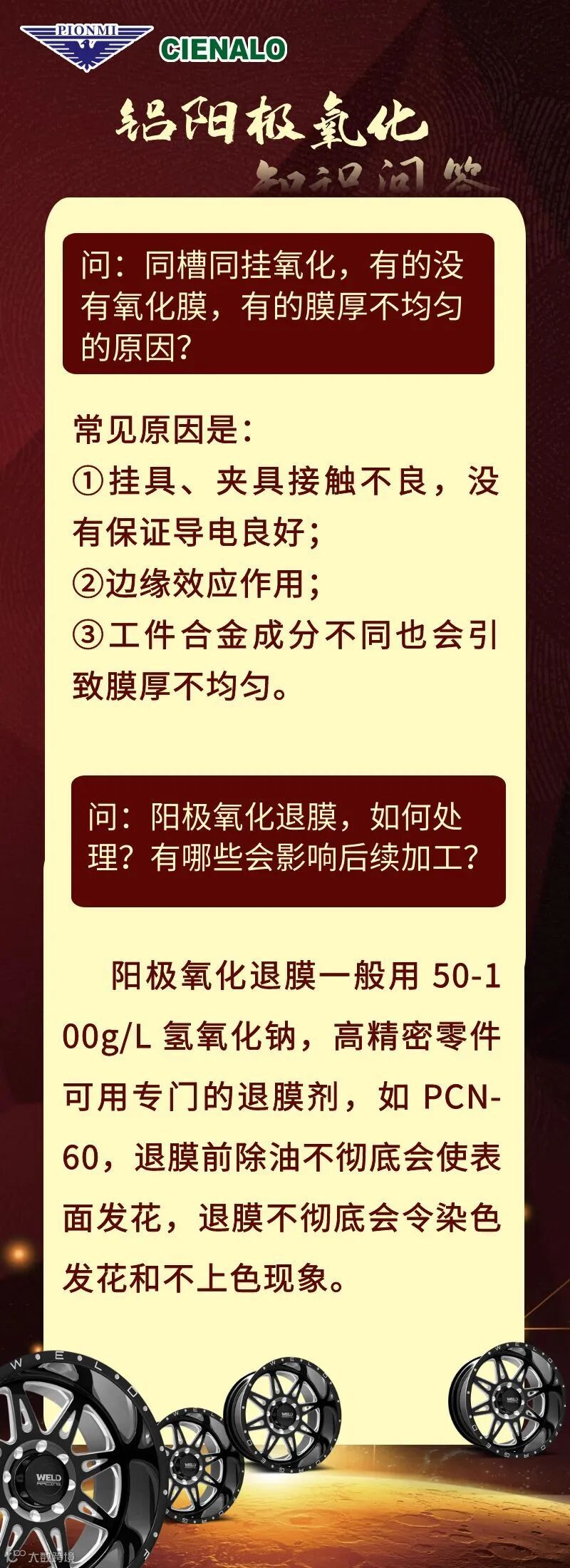 导读:问&答问&答Q:同槽同挂氧化,有的没有氧化膜,有的膜厚不均匀的原因?Q:阳极氧化退膜,如何处理?有哪些会影响后续加工?