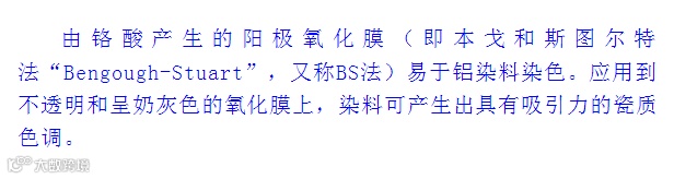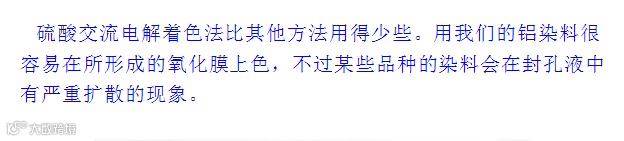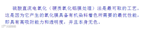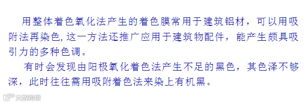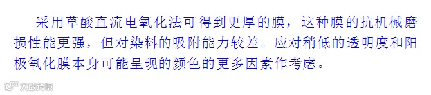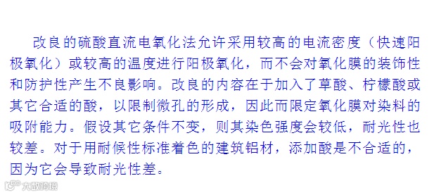 导读:电解液和电流对染色性能的影响* 硫酸直流电氧化法* 改良的直流电氧化法* 草酸直流电氧化法* 铬酸氧化法*