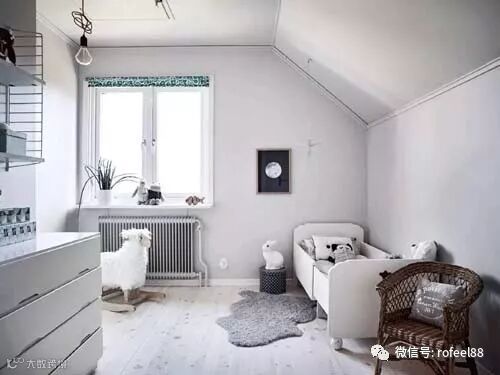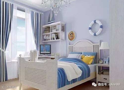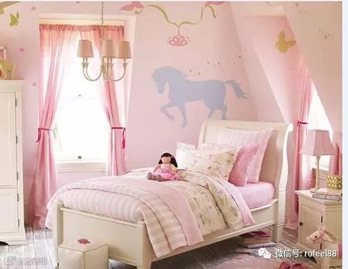 中心色为柔和的粉红色。地毯、灯罩、窗帘用红加白色调,家具白色,房间局部点缀淡蓝、有浪温气氛。
