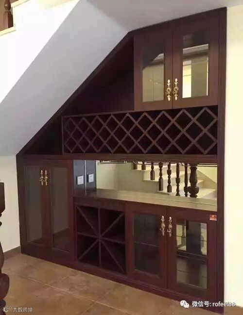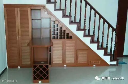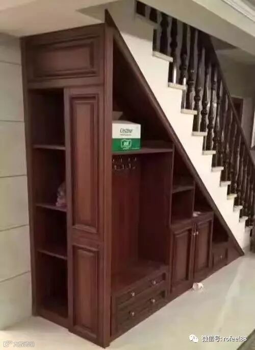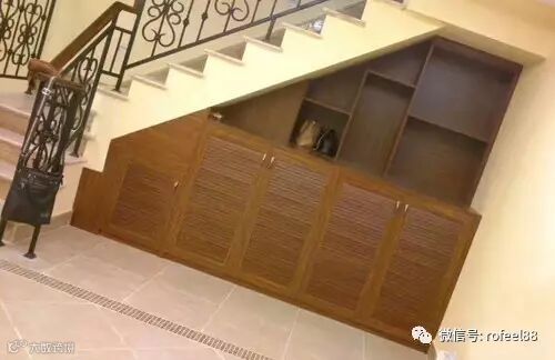 将楼梯下多余空间设计成储物柜,既可解决空间不足问题,又能让储物空间加大,既美观又实用。