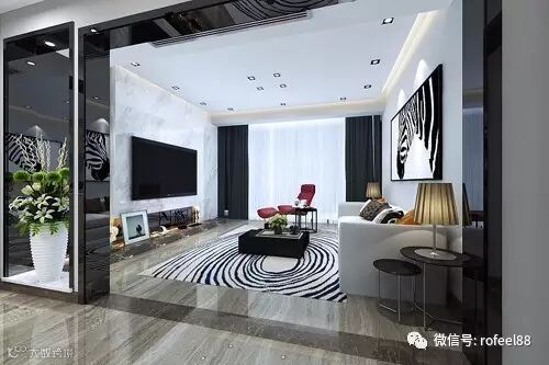 虽说黑白配很有时尚感,但客厅内如果完全用黑白两色,容易让人产生紧张、烦躁的情绪,局促不安。如果想要空间变得亮堂、有现代感,最好是将白色用为主色调,局部用其他色彩加以点缀。