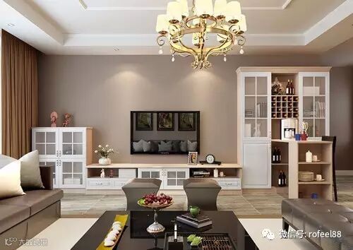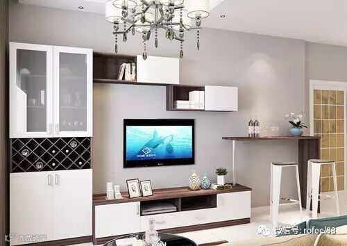 在电视柜组合中,除了作展示和储物功能外,还可以腾出一点点小空间来当做酒柜,装上酒格最好不过,装成玻璃柜子藏酒也不赖。这样,充分利用了客厅的空间,还一次性装好了各式柜子,避免了电视柜只放电视的浪费。