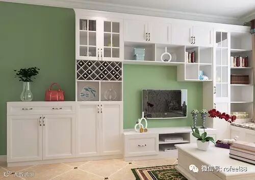 这款风格清新的整体柜,从左数到右,有鞋柜,有储物柜,有电视柜,有展示柜,有书柜,还有酒柜。酒柜所占据的空间不多,但要放那么区区几瓶酒是没有问题的。
