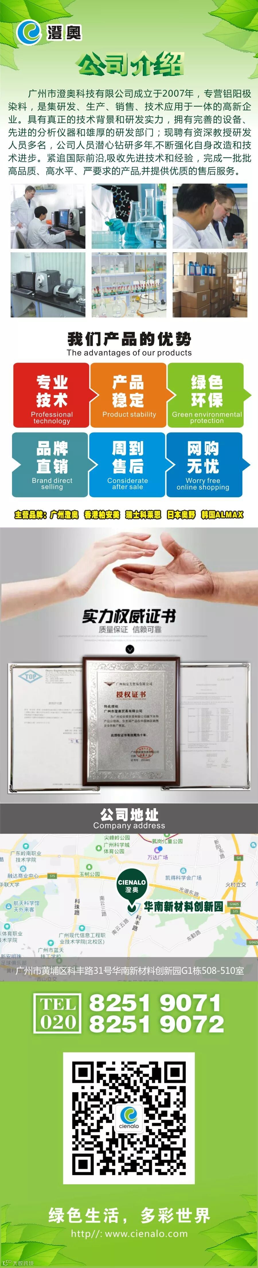 一、用 途: 适用于铝阳极氧化吸附染色的水溶性染料,产生带金黄的橙色调,仅推荐用于室内,不建议使用打气及强烈过滤。由于染料在某些特定条件下会产生霉变现象,因此新开染液需添加防霉剂。