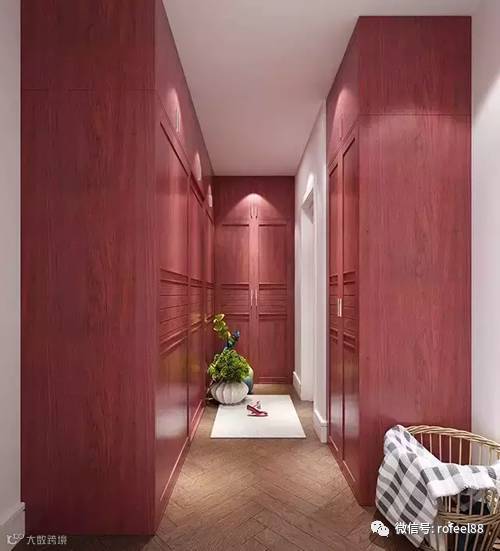 狭长的衣帽间也有大作为,移门衣柜搭配掩门衣柜,单一的红色占据了整个视线,一盆绿植,一个衣篓……便给生活以不同新鲜感。