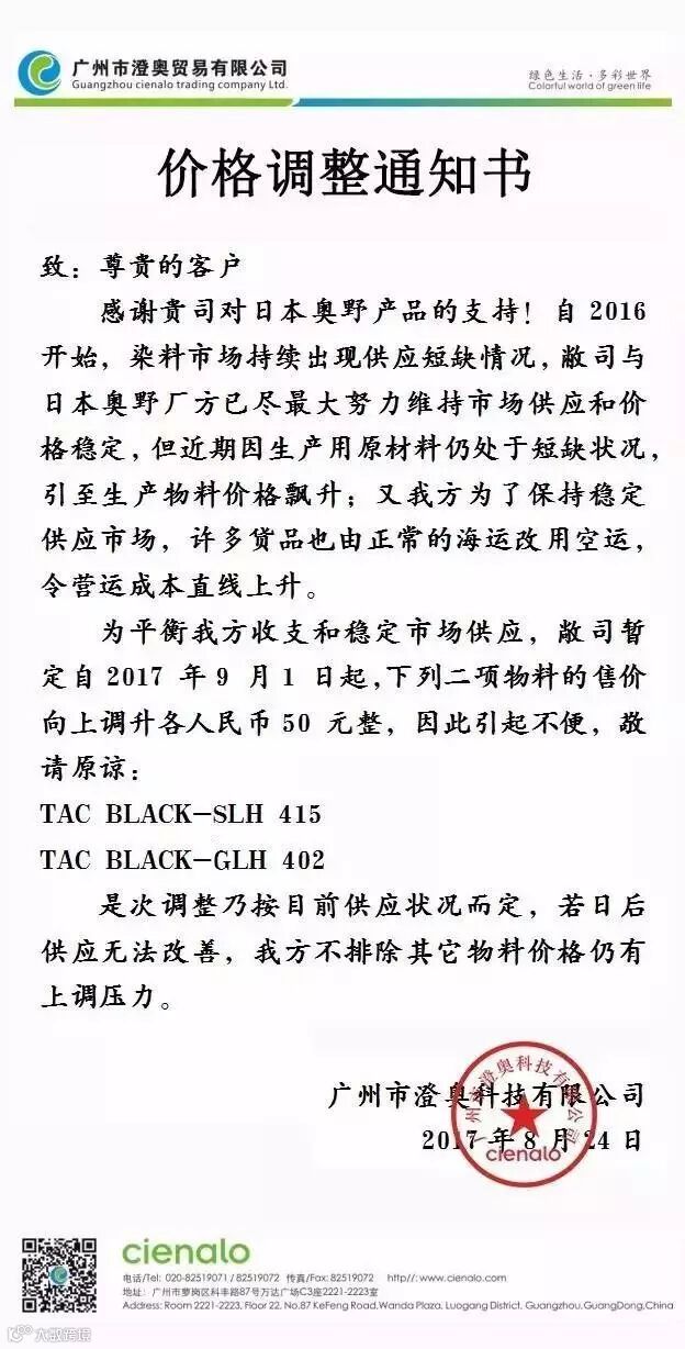 导读:致: 尊贵的客户感谢贵司对日本奥野产品的支持! 自2016 开始, 染料市场持续出现供应短缺情况,敝司与日本