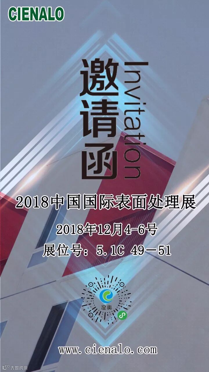 首先感谢您在过去的时光里对澄奥公司的关注和支持!感谢您对我们所有工作的理解和肯定!在此,代表公司全体员工为您送上最真挚的问候和最衷心的祝福!我公司将于2018年12月4-6日参加第三十一届中国国际表面处理、涂装及涂料产品展览会,我们诚挚邀请您亲临展会,参观、指导和洽谈!
