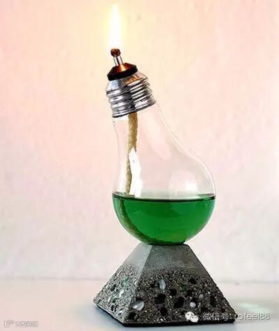日本灯泡油灯。回收废旧的白炽灯泡,并亲手制作混凝土或者木制的灯托,环保时尚。