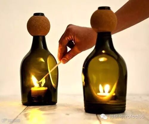 漂亮的烛台。在玻璃瓶回收再利用的过程中,很好地利用了玻璃工艺,再配上软木制的配件,使得这个烛台摆脱了以往废物利用给人的粗糙感,赋予了一种精致的品质感。