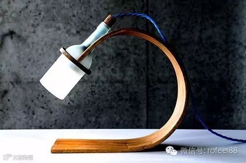 用废酒瓶切割而成的台灯。切开的葡萄酒瓶的上半部分做成的灯罩,磨砂效果让灯光更加柔和;灯座用从当地回收的废木头做成,在高温下用蒸汽蒸并弯曲,然后定型;光源为一个 LED 灯泡。