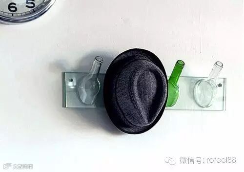 回收玻璃瓶挂衣架。设计师将其切割,再安置在镜面的板上,变成一个美观的挂衣架,功能还挺多,可以当镜子、可以给瓶口留言便签、给瓶颈挂上服饰。