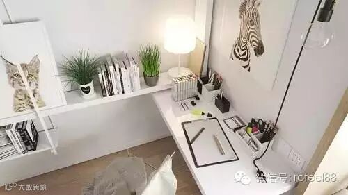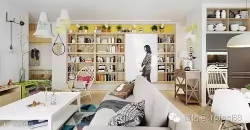 整个空间给人非常舒适愉快的视觉感受,用淡色木质做成的家饰搭配白色调,彰显最经典的北欧风搭配,黄色与蓝色一定是空间中最精彩的部分,书架的顶端用黄色填满,与青葱的绿植相映,清新活泼十分的有趣。