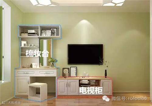 ▲简易的梳妆台与简易的电视柜相连组合,虽然连线稍微有点长,但并不会占用太大面积,电视柜下方抽屉可摆放碟片,抽屉上方可摆放碟机或机顶盒等。