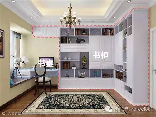 ▲一个大型到顶L型书柜已经非常占用空间,若另外再摆一张书桌难免显得拥挤。直接在书柜左侧延伸出一块板用作书桌,既不会占用很大空间,又能让组合柜看起来很连贯,更有美感。