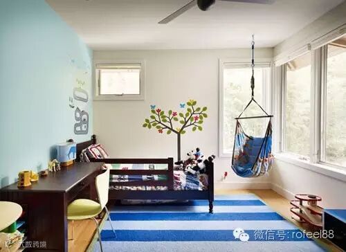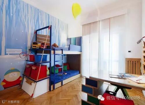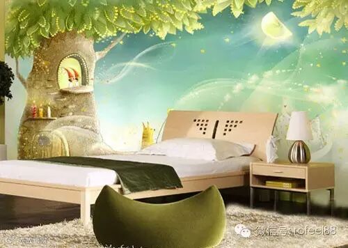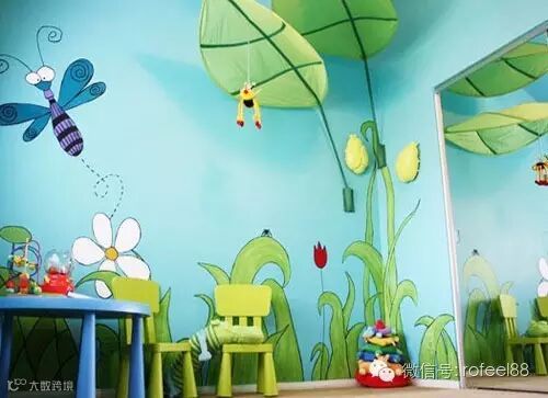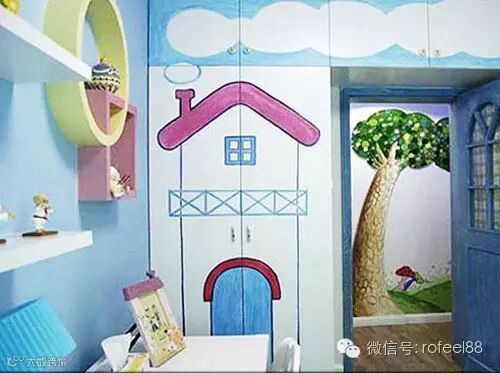 一颗小树在墙上蔓延开来,几只蝴蝶在鲜艳的花朵旁翩翩起舞,而墙上的另一边画上了孩子喜欢的图案。