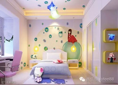 手绘墙描绘了一个喜欢编织梦想的小姑娘在乘着肥皂泡泡飞翔的情景,周围之呼应的圆形镂空图案则完全可以DIY制作,充满了童趣,却又不失智慧与理性的光芒。