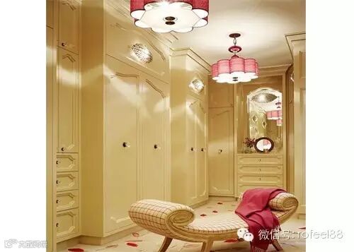 在暖黄的灯光下,鲜艳玫红的吊顶和地毯花瓣都装点出衣帽间独有的女性风采。创意个性的长椅方便换衣。封闭性好保证了衣帽间的私密性。
