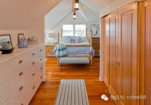 在阁楼的卧室的对面精巧的设计上收纳柜和衣橱,就算空间小,也可以有发挥:美妙的摆件和手工气息浓厚的吊顶。