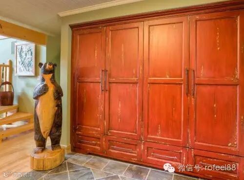 复古的衣柜充满女生独有的文艺气质,旁边的涂漆雕像,憨态可掬的熊像是守卫般守护。